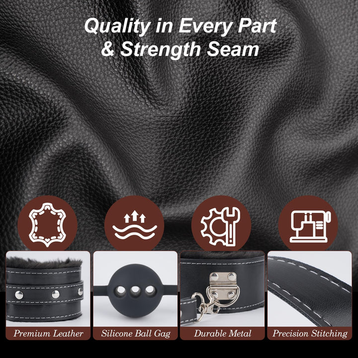 Sisältää silikonisen suukapulan, keinonahkaiset kahleet ja vahvistetut saumat turvallisuutta, mukavuutta ja pitkäaikaista käyttöä varten.
